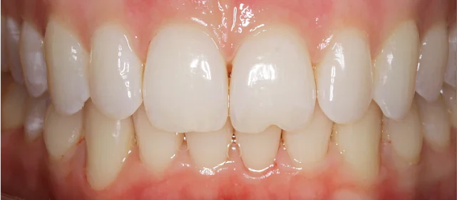 Проблема: В клинику обратилась пациентка — беспокоили неровные зубы и неправильное смыкание. Зубные ряды сходились некорректно, зубы стояли со смещением, что влияло и на внешний вид, и на распределение нагрузки при жевании.