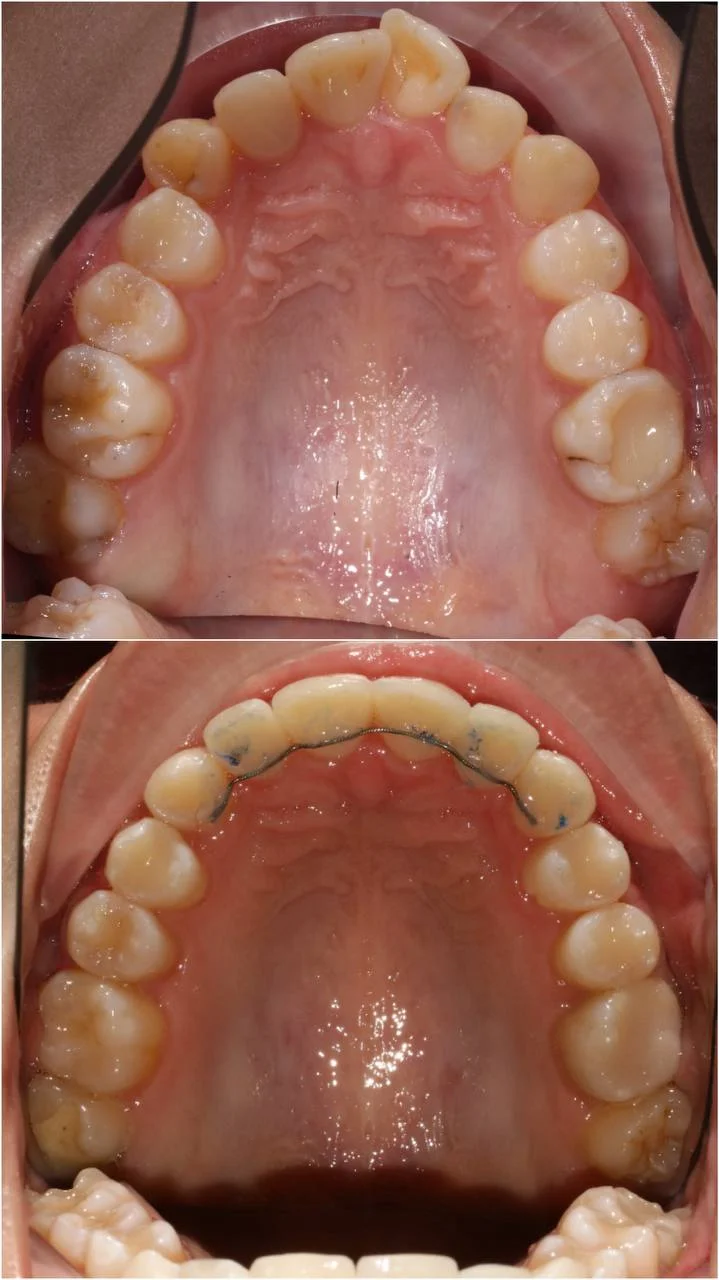 Зубы выровнены, смыкание нормализовано. Установлены несъёмные ретейнеры на обе челюсти, изготовлены ретенционные капы. Пациентка предварительно проконсультирована ортопедом онлайн.