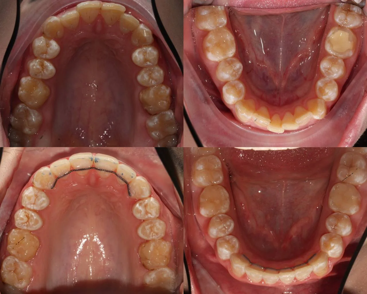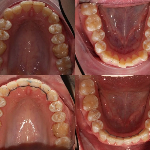 Зубы выровнены, смыкание нормализовано. Установлены несъёмные ретейнеры на обе челюсти, сняты сканы для ретенционных кап.