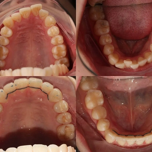 Решение: Поставили прозрачные элайнеры Spark на обе челюсти. Случай оказался объёмным — основной набор составил 53 капы. После основного этапа потребовалась небольшая доработка: дозаказали 12 кап для финальной подгонки. Итого 65 кап за 29 месяцев. Параллельно следили за состоянием дёсен — проводили профессиональную гигиену. В результате зубы ровные, смыкание в норме, ретейнеры на обе челюсти, сканы для кап сняты.