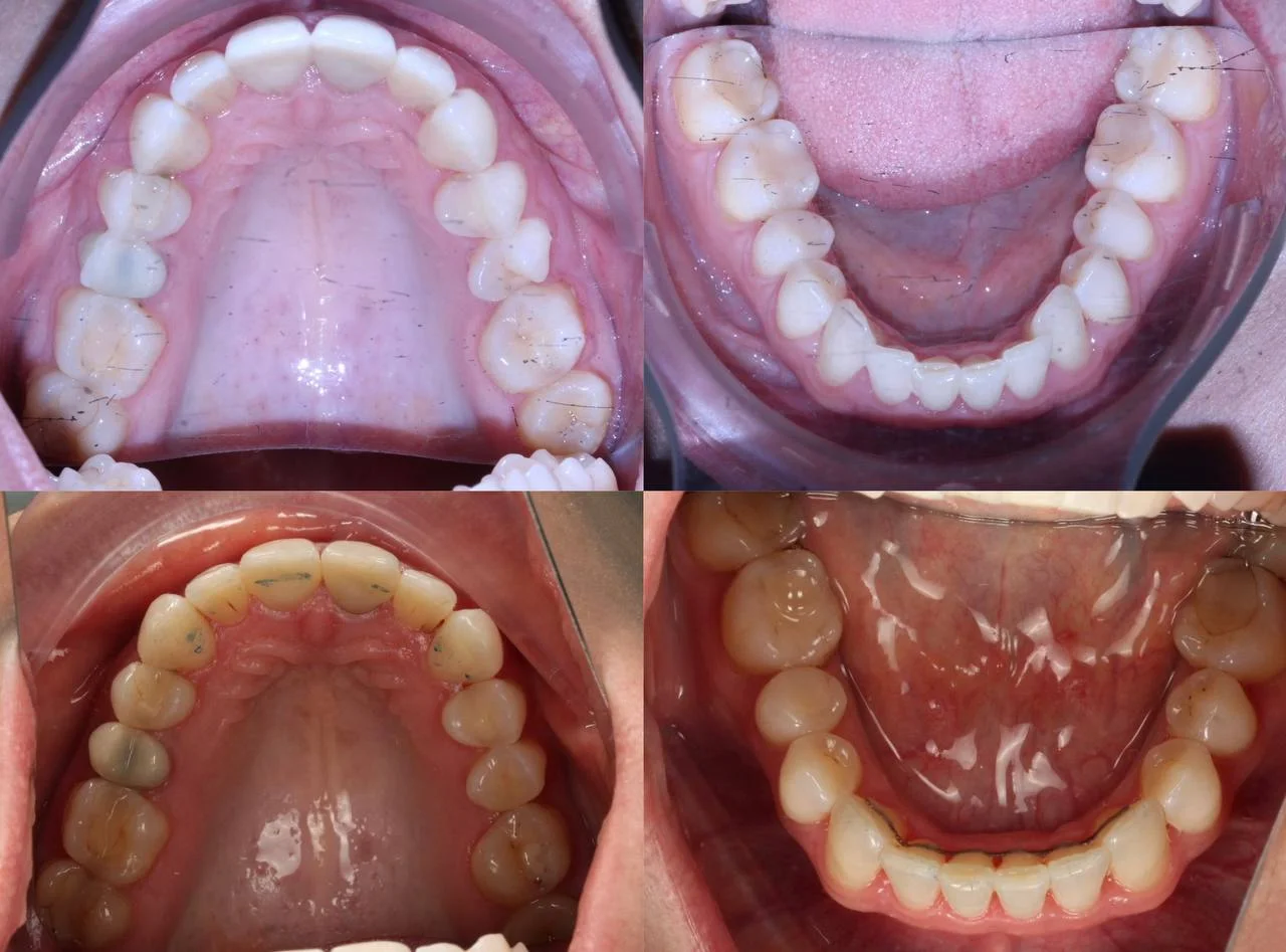 Зубы выровнены, скученность устранена, прикус исправлен, линия смыкания нормализована. Ретейнер установлен на нижнюю челюсть. На верхней ретейнер не ставили — на передних зубах коронки, вместо этого изготовлены ретенционные капы на обе челюсти. Пациентка направлена к ортопеду для замены коронок.