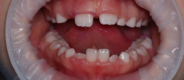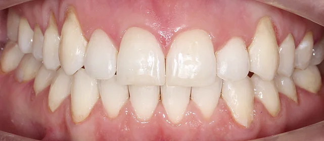 Обе челюсти сужены, передние зубы стояли скученно. Средние линии верхних и нижних зубов не совпадали. Тенденция к открытому прикусу — передние зубы не смыкались полностью. При этом клыки смыкались правильно (I класс по Энглю) — основная проблема в положении зубов, а не в соотношении челюстей.