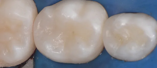 Зуб 2.6 - массивная пломба, ИРОПЗ около 60%. Имеются композитные реставрации на зубах 2.1, 2.2, 2.4, отвечающие предъявляемым требованиям. Имеются сколы эмали на режущих краях зубов 1.2, 1.1, 2.1, 2.2.