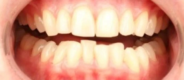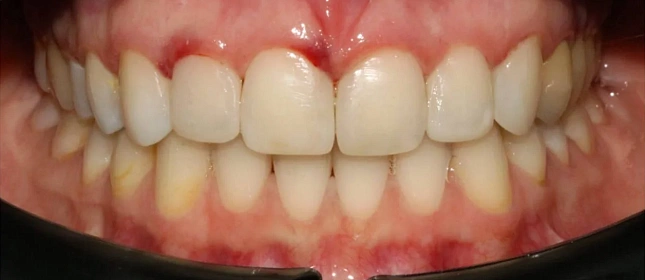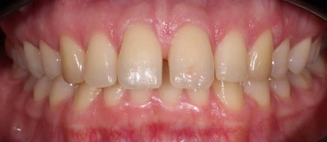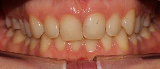 Обе челюсти сужены, передние зубы стояли скученно. Средние линии верхних и нижних зубов не совпадали. Тенденция к открытому прикусу — передние зубы не смыкались полностью. При этом клыки смыкались правильно (I класс по Энглю) — основная проблема в положении зубов, а не в соотношении челюстей.