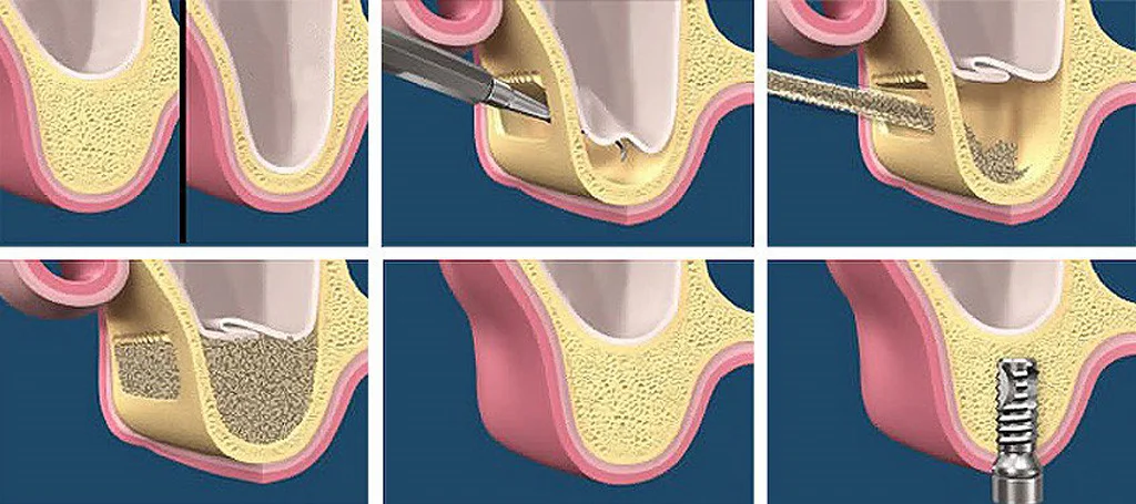 В проекции верхнечелюстной пазухи высверливается «боковое окно». Врач отодвигает слизистую дна пазухи. Между полостью и слизистой размещается коллагеновая мембрана. Остальное пространство заполняется материалом. Зона закрывается тканями, накладываются швы.Врач делает отверстие для будущего импланта. Дно пазухи аккуратно отодвигается. В образовавшуюся полость закладывается выбранный материал.