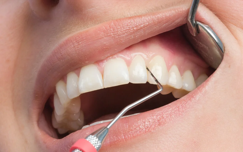 - Глубокий десневой карман. Формирование зазора между поверхностью зуба и десной говорит о поражении соединительной ткани, которая отвечает за фиксацию зубных единиц. Они визуально удлиняются, но ещё сохраняют статичное положение.
