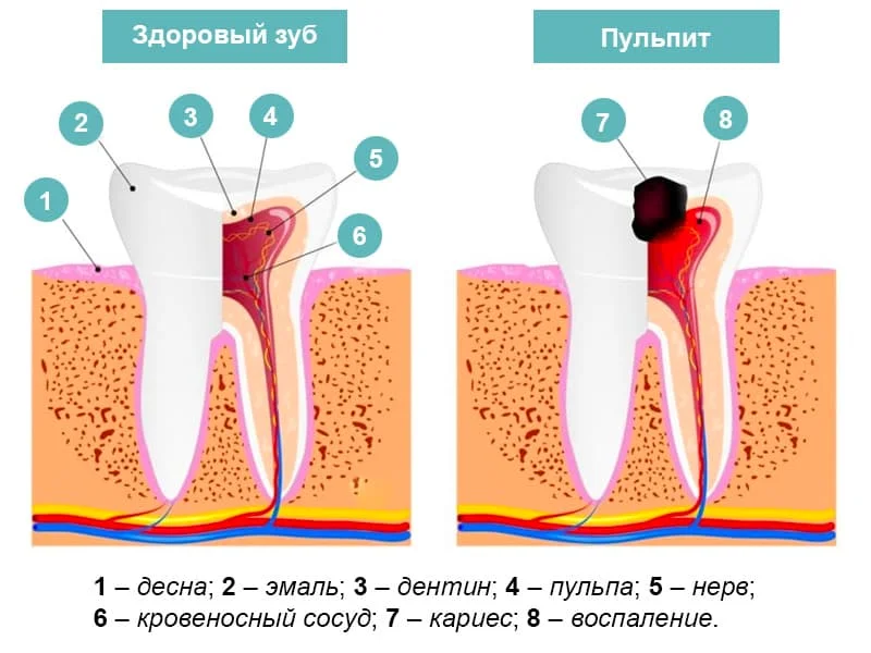 Пульпа отвечает за питание зуба. В ней расположено много нервных окончаний и кровеносных сосудов, которые обеспечивают нормальное функционирование элементов пародонта. При выраженном разрушении зубной единицы пульпа становится уязвимой для деятельности патогенных микроорганизмов. Твёрдые ткани больше не защищают её от попадания инфекции, на фоне чего развивается пульпит. К основным причинам возникновения болезни стоматологи относят: