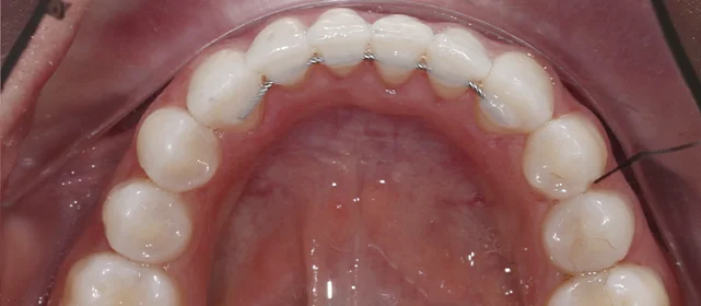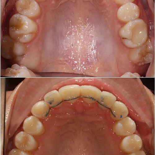 Зубы выровнены, смыкание нормализовано. Установлены несъёмные ретейнеры на обе челюсти, изготовлены ретенционные капы. Пациентка предварительно проконсультирована ортопедом онлайн.