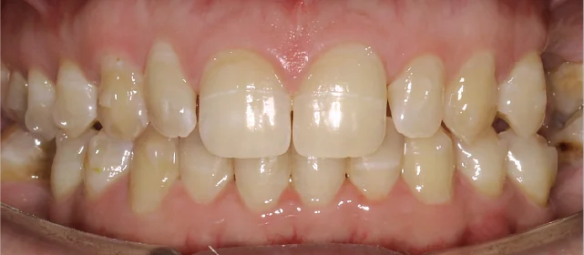 Проблема: В клинику обратилась пациентка — беспокоили неровные зубы и неправильное смыкание. Зубные ряды сходились некорректно, зубы стояли со смещением, что влияло и на внешний вид, и на распределение нагрузки при жевании.