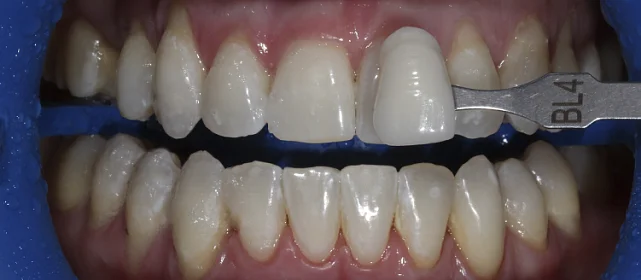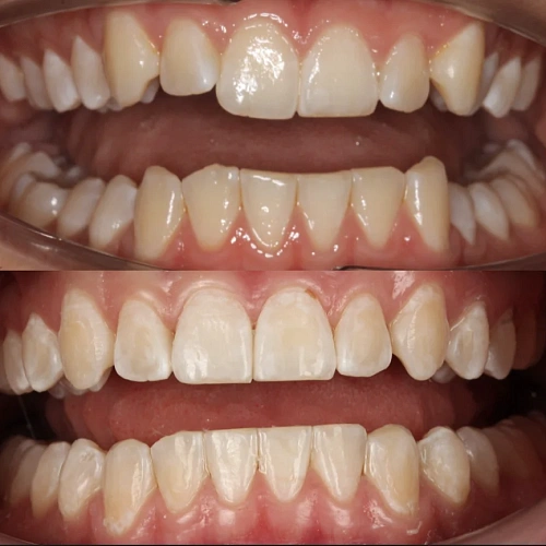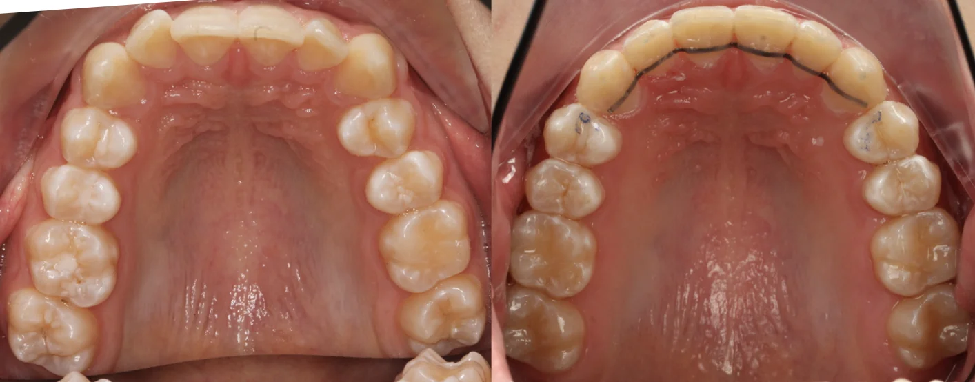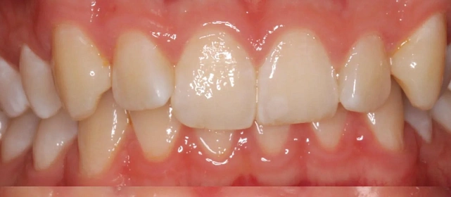 Проблема: В клинику обратился мужчина с жалобами на неправильное положение зубов и смыкание — ряды сходились некорректно, зубы стояли со смещением. При этом было важно, чтобы лечение оставалось незаметным для окружающих, поэтому вариант с брекетами не рассматривался.
