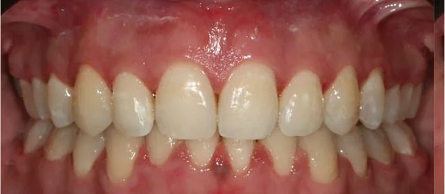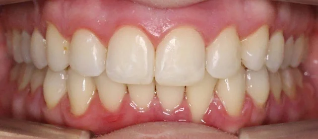 полное выравнивание зубных рядов без удаления зубов. Рецессия десны не прогрессировала (контроль по КТ через 12 месяцев). Пациентка носит несъёмные ретейнеры