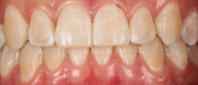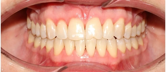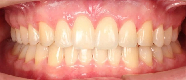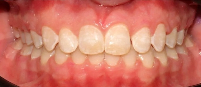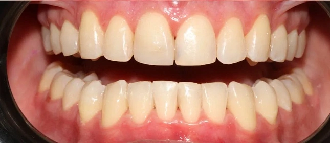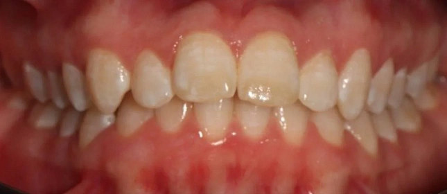 Обе челюсти сужены, передние зубы стояли скученно. Средние линии верхних и нижних зубов не совпадали. Тенденция к открытому прикусу — передние зубы не смыкались полностью. При этом клыки смыкались правильно (I класс по Энглю) — основная проблема в положении зубов, а не в соотношении челюстей.