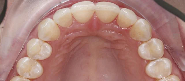 Верхняя челюсть выступала вперёд относительно нижней с обеих сторон (II класс по Энглю). Обе челюсти сужены, зубы стояли скученно. Нарушена кривая смыкания — жевательные зубы были на разной высоте. На двух передних зубах верхней челюсти ранее установлены металлокерамические коронки.