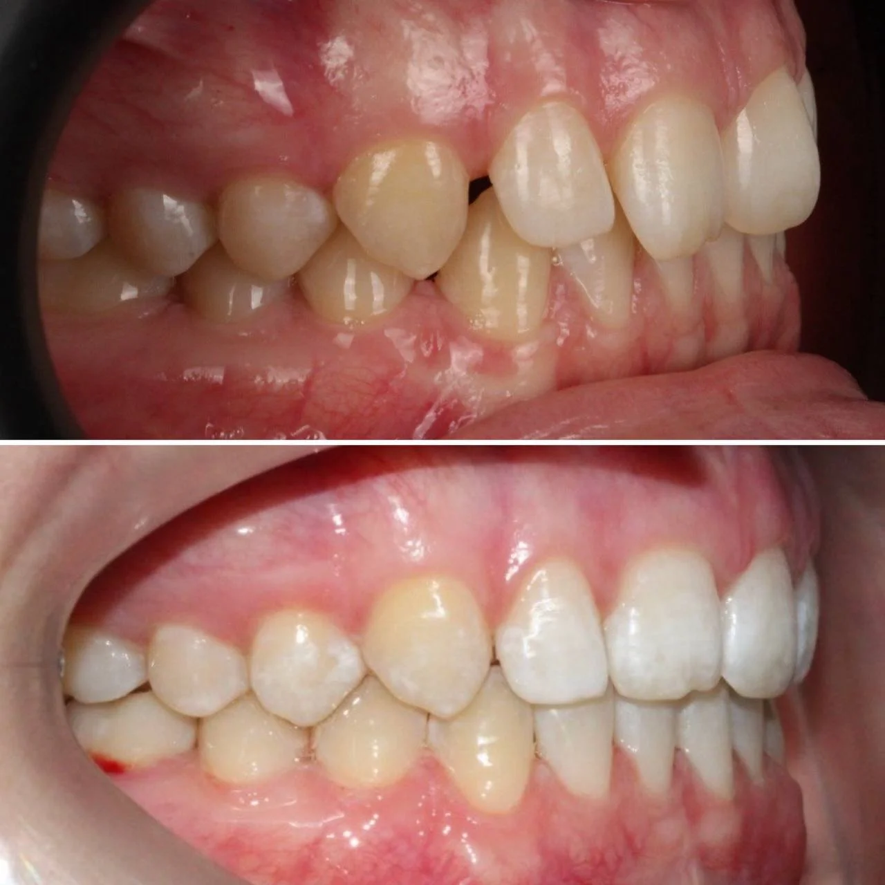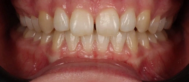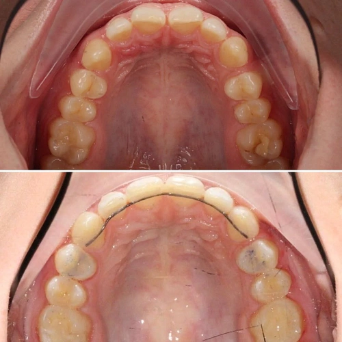 Проблема: Пациентка обратилась с одной жалобой — неровные зубы. При осмотре обнаружили, что обе челюсти сужены, зубам банально не хватает места, отсюда скученность. Зубы здоровые, ортопедия не нужна — чисто ортодонтический случай.