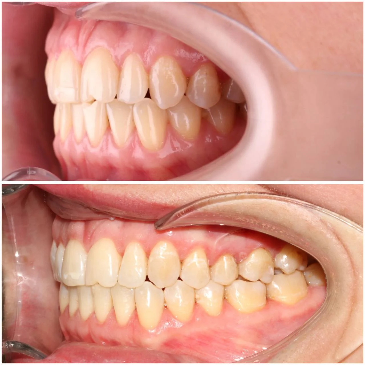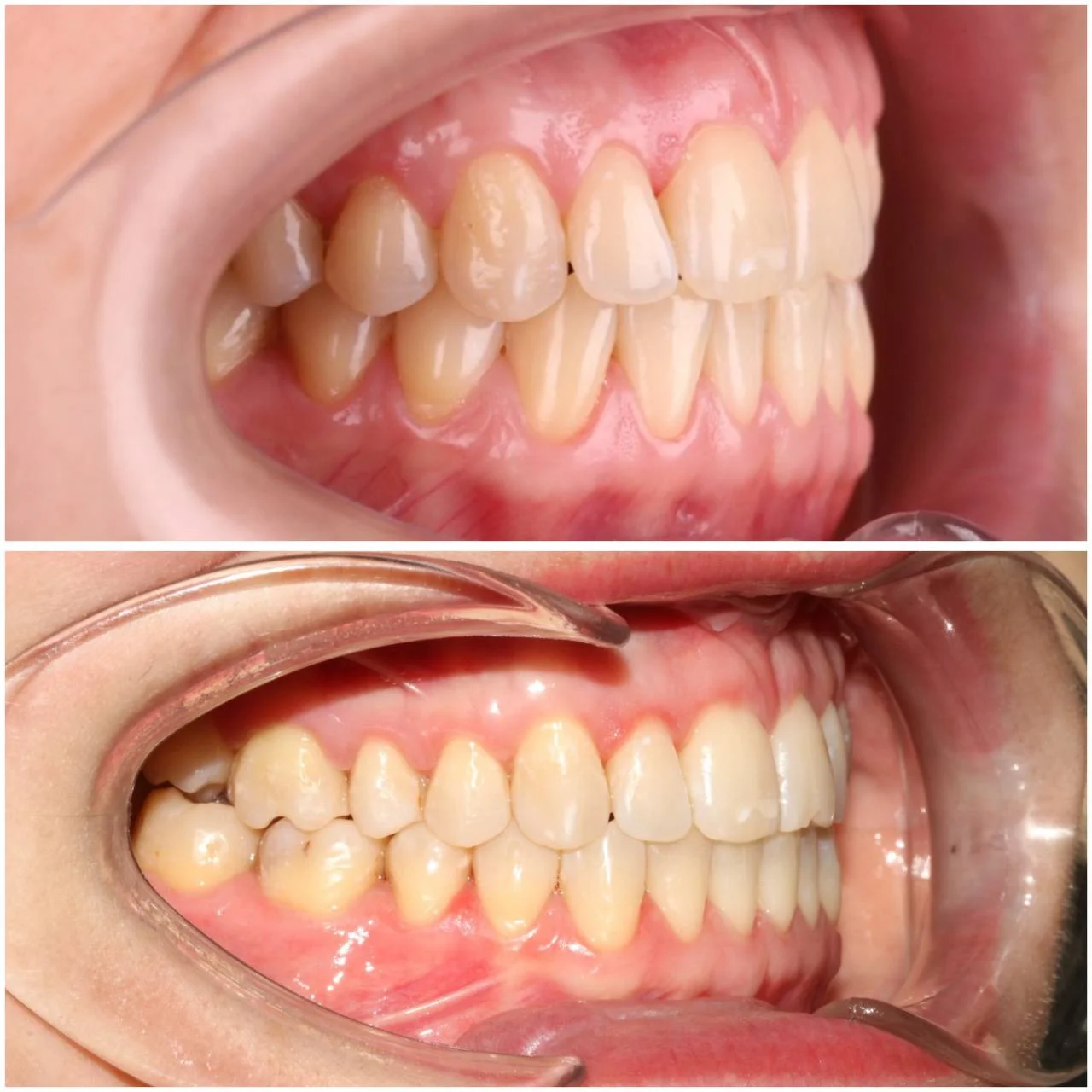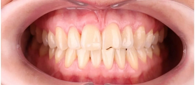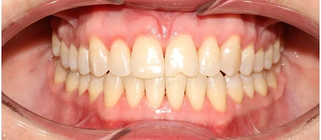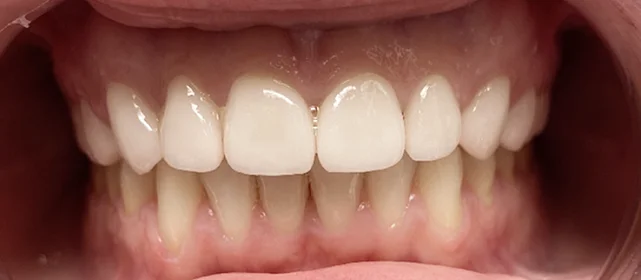 Обе челюсти сужены, передние зубы стояли скученно. Средние линии верхних и нижних зубов не совпадали. Тенденция к открытому прикусу — передние зубы не смыкались полностью. При этом клыки смыкались правильно (I класс по Энглю) — основная проблема в положении зубов, а не в соотношении челюстей.