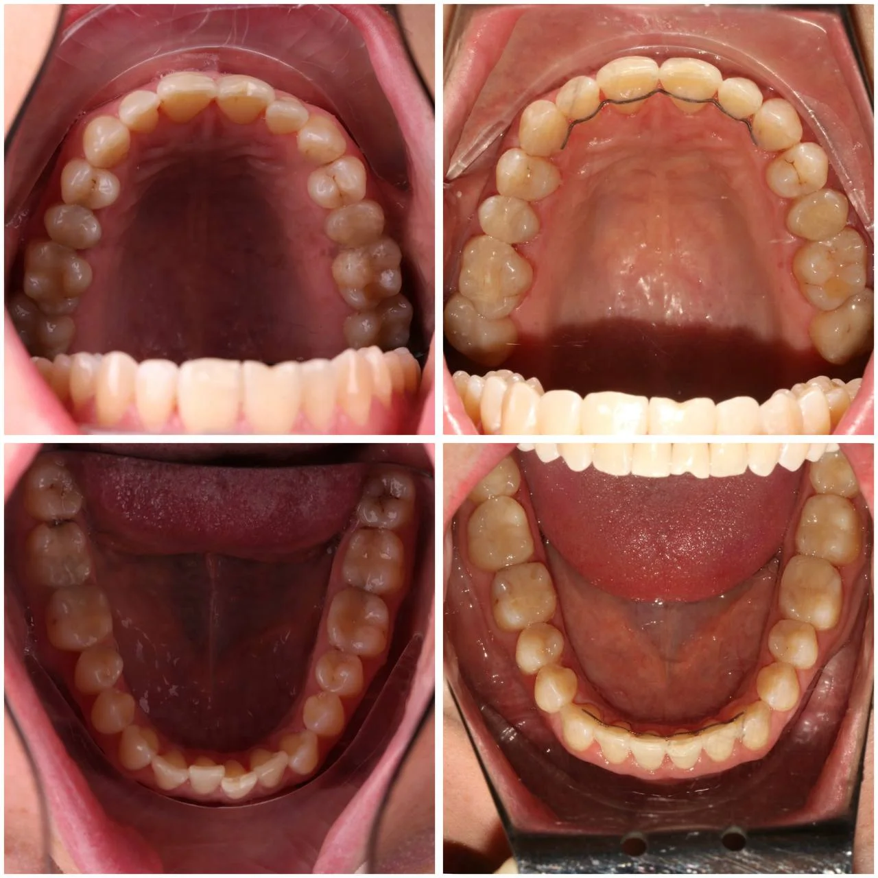 Решение: Поставили прозрачные элайнеры Click, всего 20 кап на обе челюсти. Хватило одного набора, без дозаказов. За 9 месяцев расширили зубные дуги, убрали скученность, выровняли средние линии, скорректировали тенденцию к открытому прикусу. Перед ретенцией провели профессиональную гигиену. Зафиксировали ретейнеры на обе челюсти, сняли сканы для ретенционных кап. Пациентка записана к ортопеду — но основная работа уже сделана.