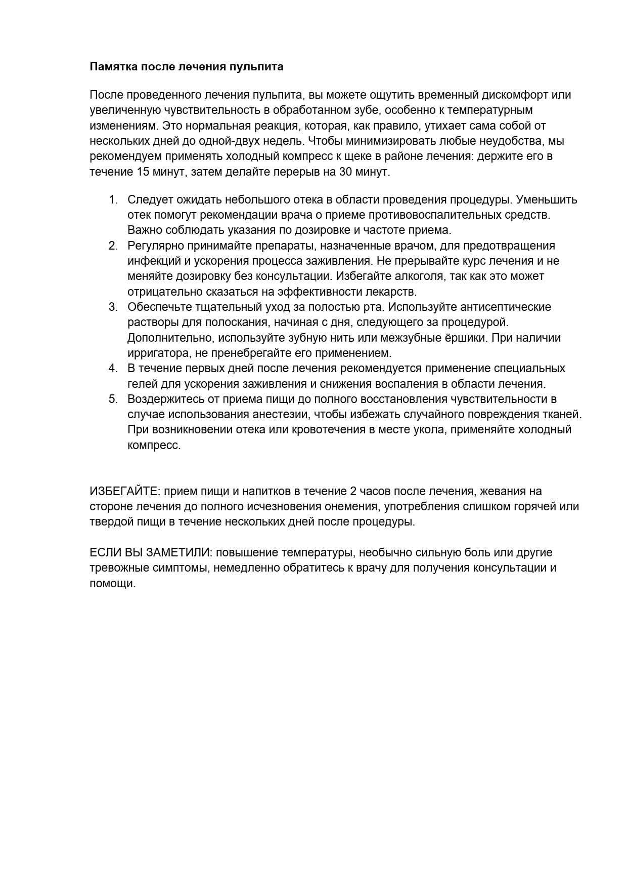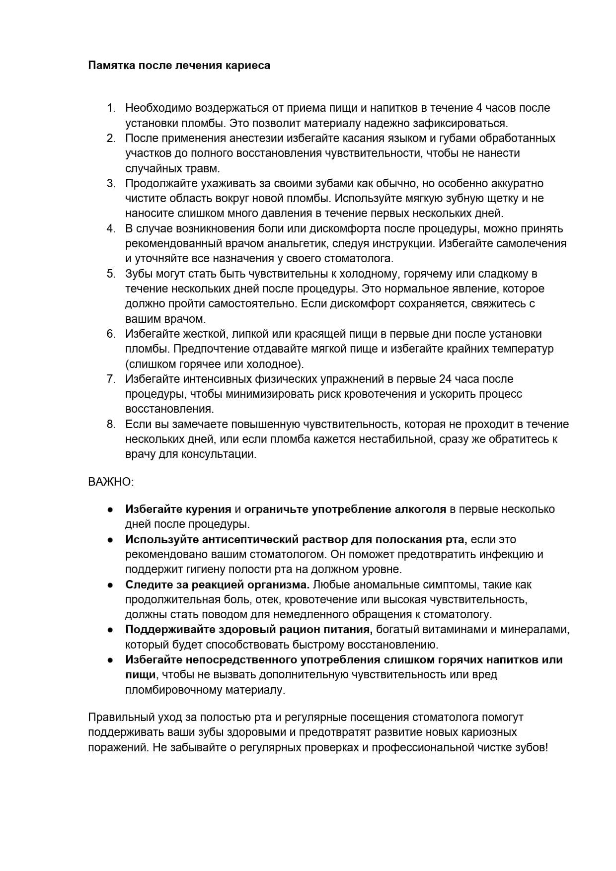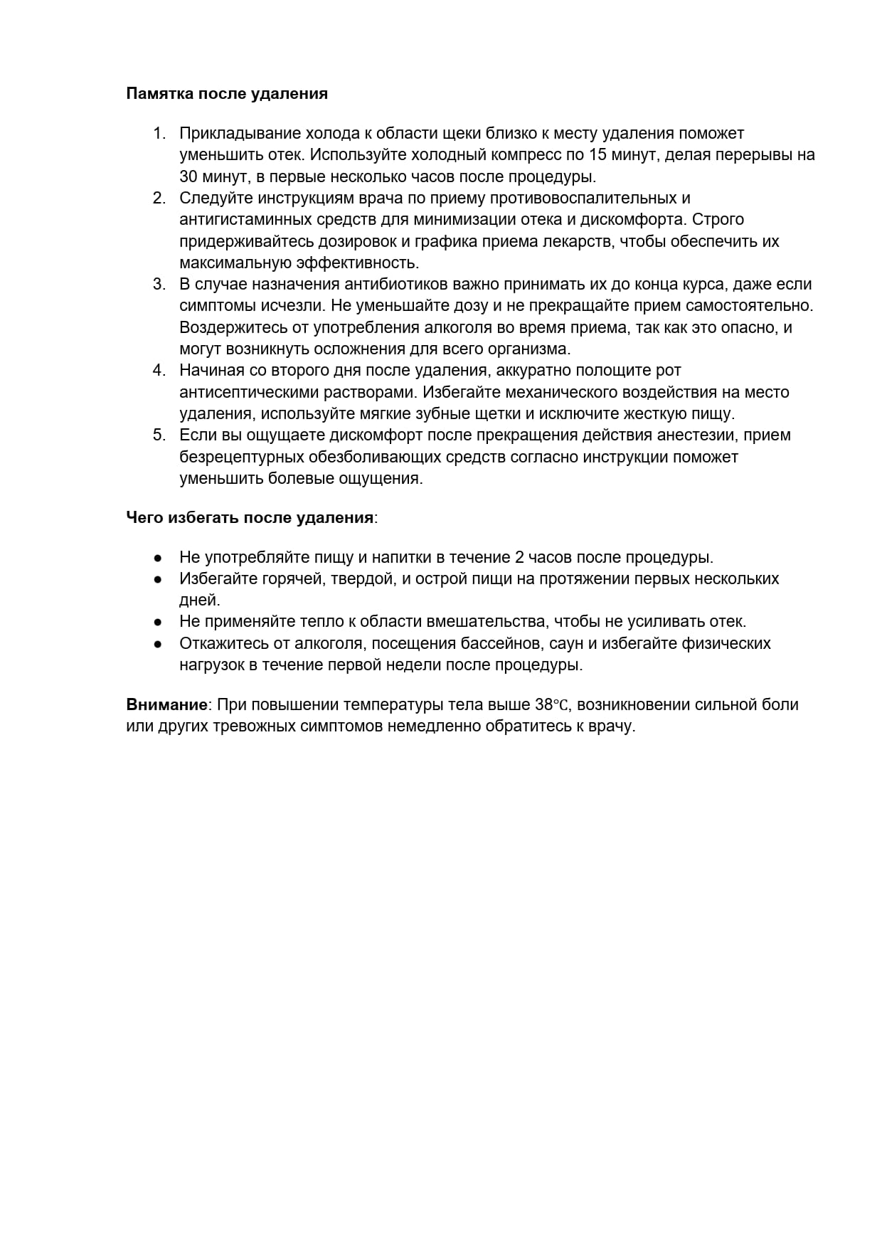 Нельзя кушать в течение 2-х часов, нельзя ничем полоскать рот в течение первых суток и употреблять горячую пищу и питье, так как это может повредить кровяной сгусток, который заполнил лунку